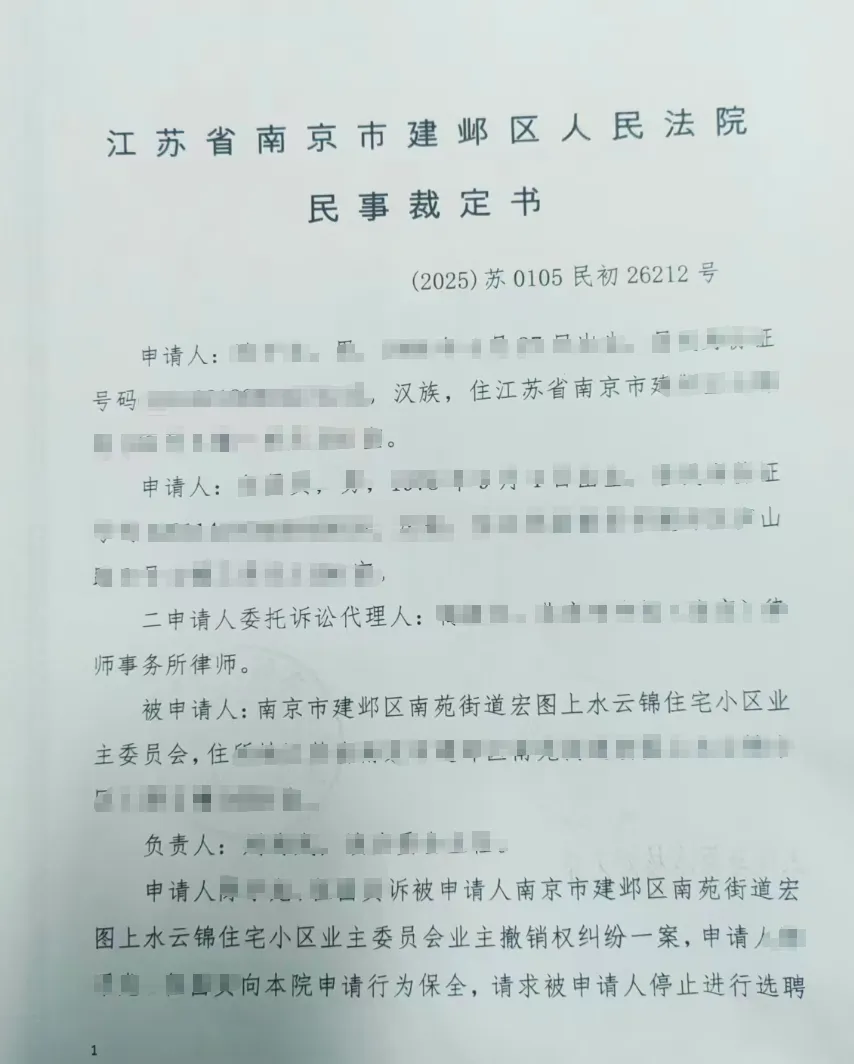 根据群友爆料,南京一个叫宏图上水云锦的小区业委会选聘物业被法院紧急停止,原因是有小区业主以自身房产为抵押物,向法院提交了停止业委会物业选聘的行为保全申请,获得支持。