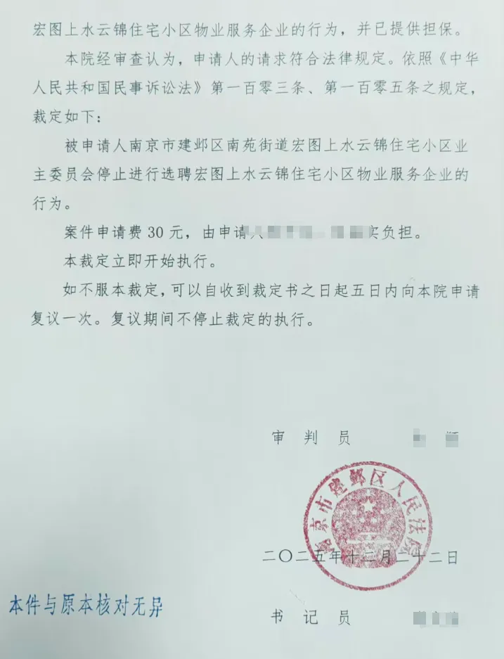 至此,宏图上水云锦小区部分业主不满情绪达到顶点,他们向法院提请对业委会违规选聘物业的撤销权,并在2025年12月22日,成功拿到法院行为保全裁定书:即在撤销权官司未有结果前,业委会停止物业选聘所有活动!
