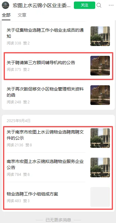 从该业委会公众号文件记录可知,2025年9月4日,该业委会一口气发布了三个文件,分别是《物业选聘工作小组组成方案》、《南京宏图上水云锦拟选物业服务企业公告》、《南京宏图上水云锦物业选聘竞聘文件公告》等。