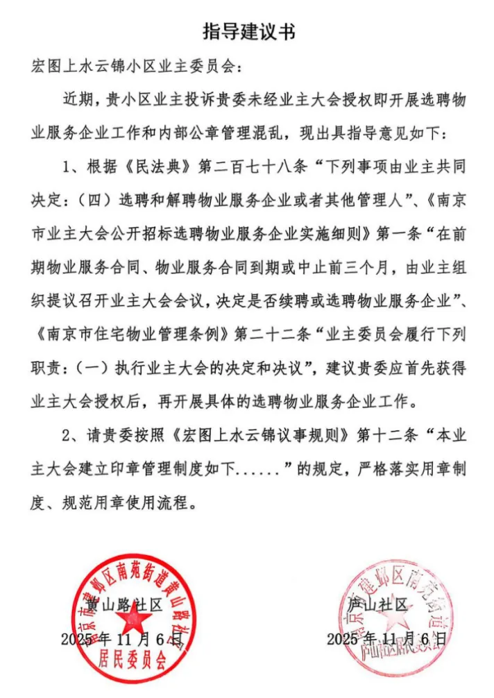 流程的混乱引来业主大规模投诉,2025年11月6日,当地社区街道向宏图上水云锦业委会发布第一份指导意见书。