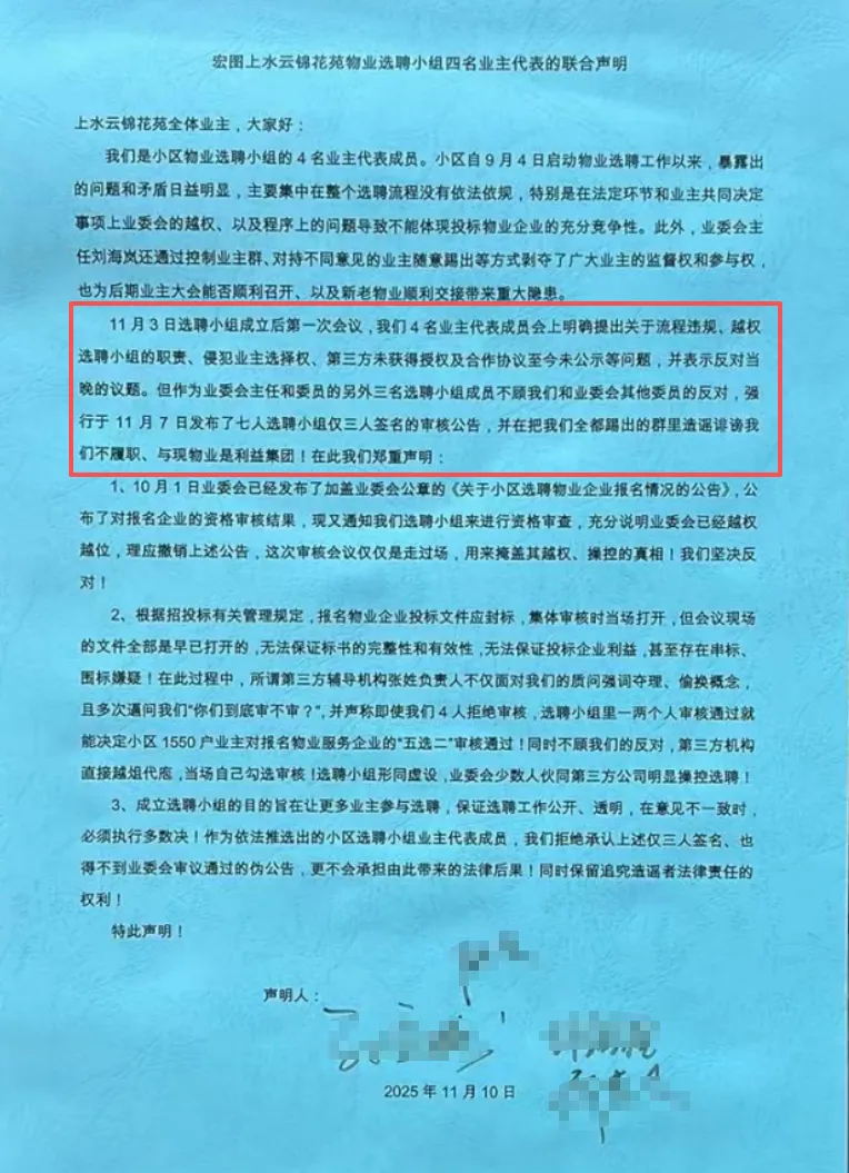 随后,2025年11月10日,选聘物业7人小组又爆出内部不和消息,选聘小组4名业主代表发表联合声明称: