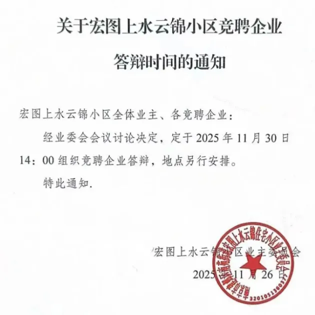 人员调整完成后,2025年11月26日,业委会继续推进竞聘物业企业答辩程序。