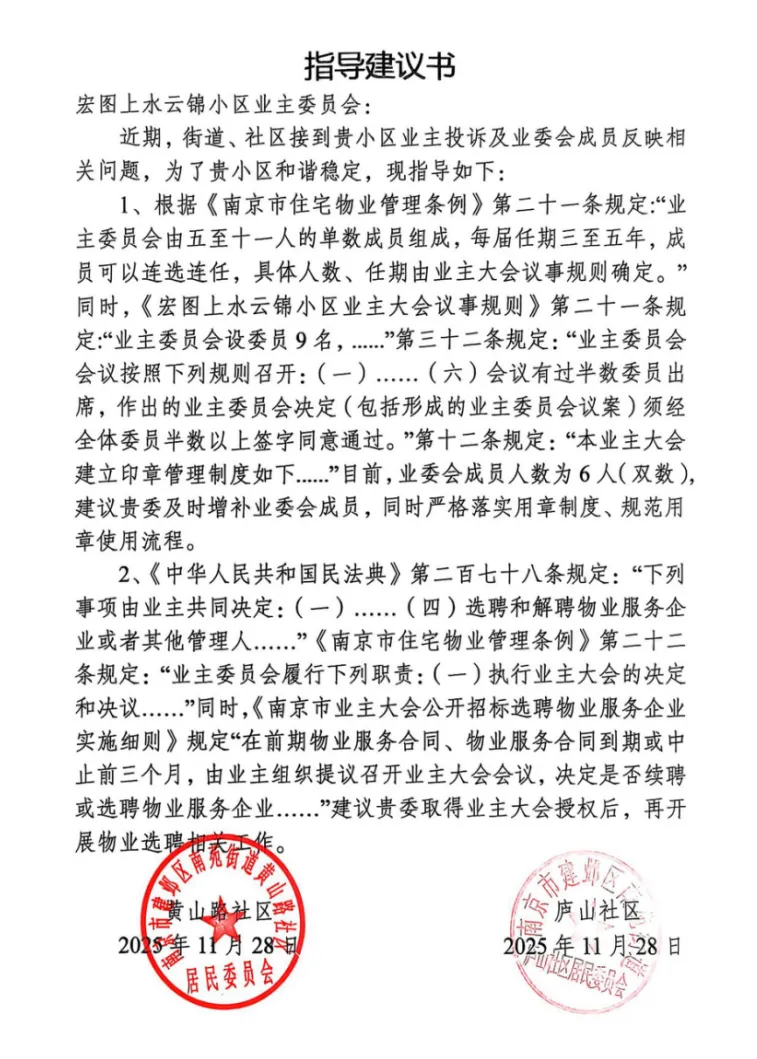 鉴于事态越发不可收拾以及小区投诉量增大,2025年11月28日,当地社区街道第二份指导建议书如期而至。