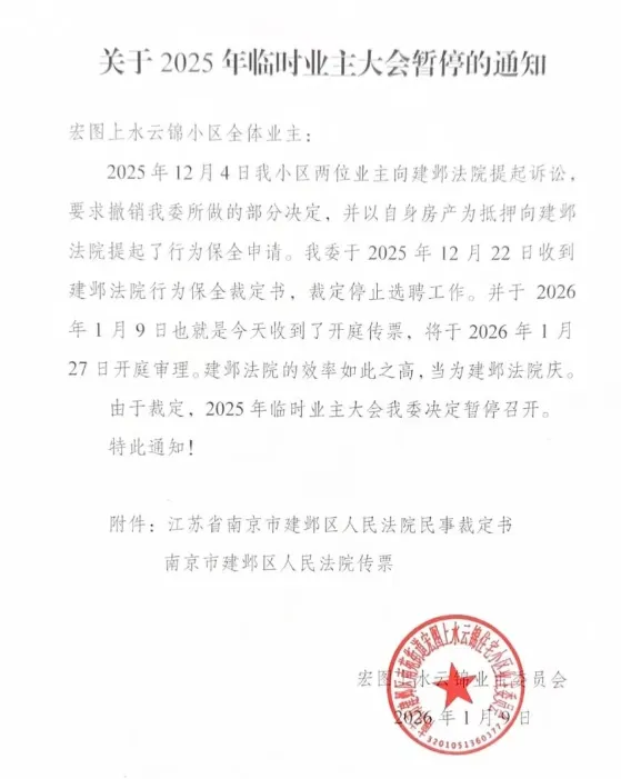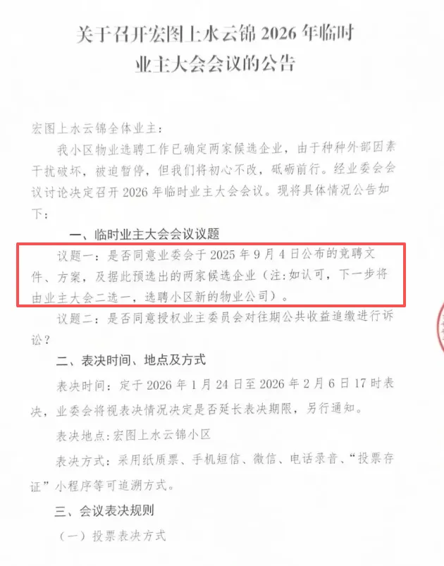 2026年1月9日,宏图上水云锦业委会最终发布业主大会停止公告,物业5进2投票随即被终止。