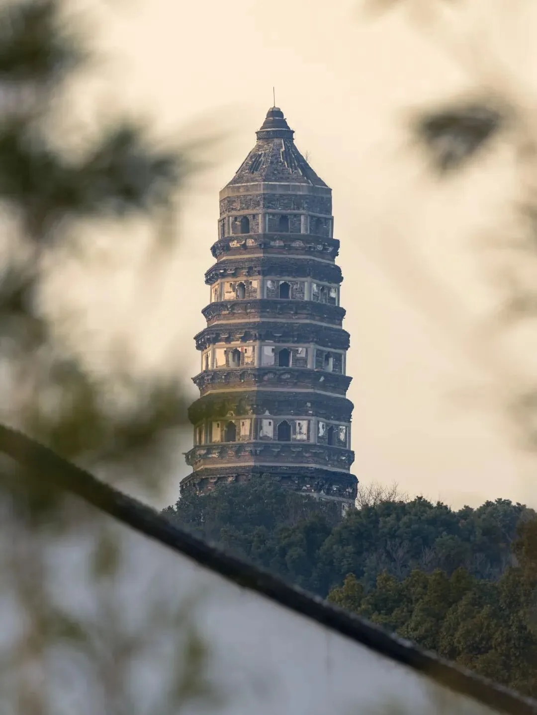 为了拍摄云岩寺塔,找了许多地点和角度,但均不满意。后无意间发现可以拿竹子当前景(所谓宁可食无肉,不可居无竹),再加入苏派建筑,暗合了苏州园林的概念,才较为满意。