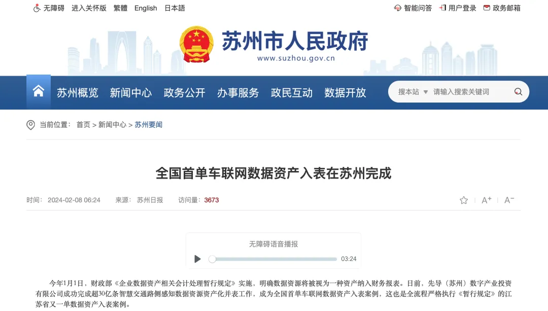 当 30 亿条智慧交通路侧感知数据,从 “无形资源” 变身 “有形资产” 赫然出现在企业财务报表上,数字经济的价值密码正被苏州破解。2024 年财政部《企业数据资源入表会计处理暂行规定》实施后,先导(苏州)数字产业投资有限公司联合苏州市大数据集团,率先完成全国首单车联网数据资产入表,不仅让超 30 亿条路侧感知数据实现资产化并入表,更打通了 “数据 — 资产 — 资本” 的转化闭环,为全国数据要素市场化改革写下了极具分量的实践注脚。