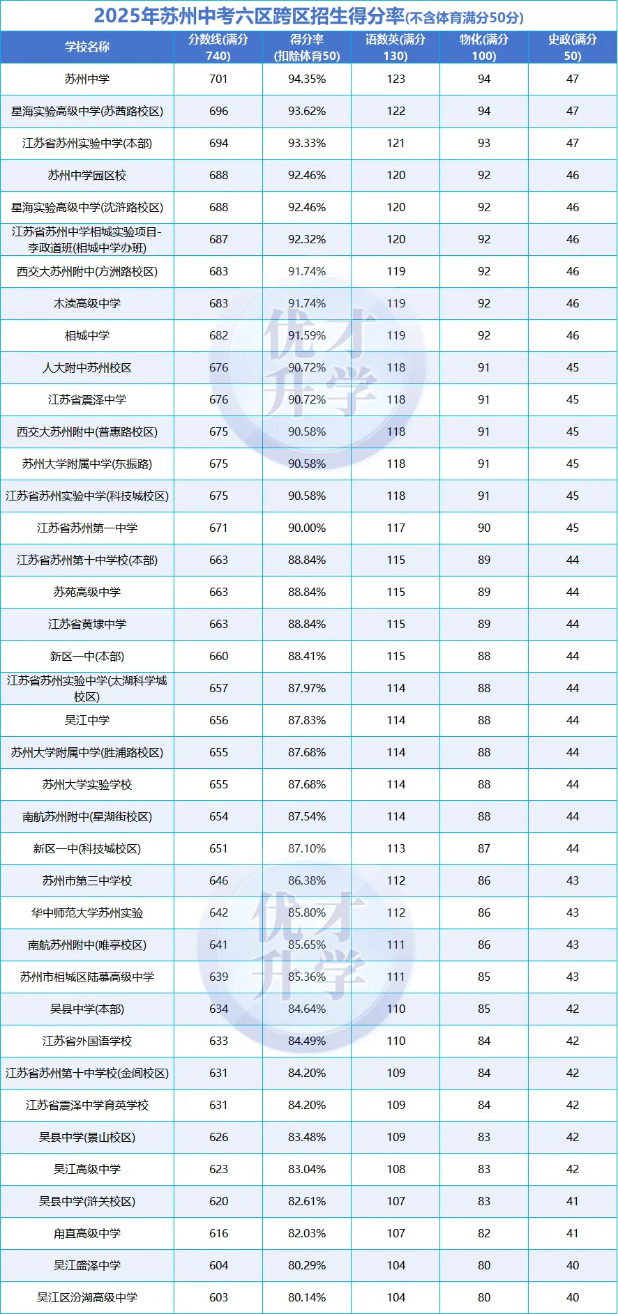 跨区分数线最低的是吴江区的汾湖高级中学,只有603分,得分率80.14%。但语数外单科分数线最低也要104.19分,物化最低80.14分!政史最低40.07分!