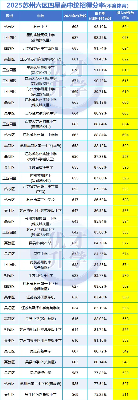 苏州各高中分数线咬的很紧,中部分数线非常集中!想要上四星高中,统招得分率至少达到75.22%以上!中考每科最多扣25分!