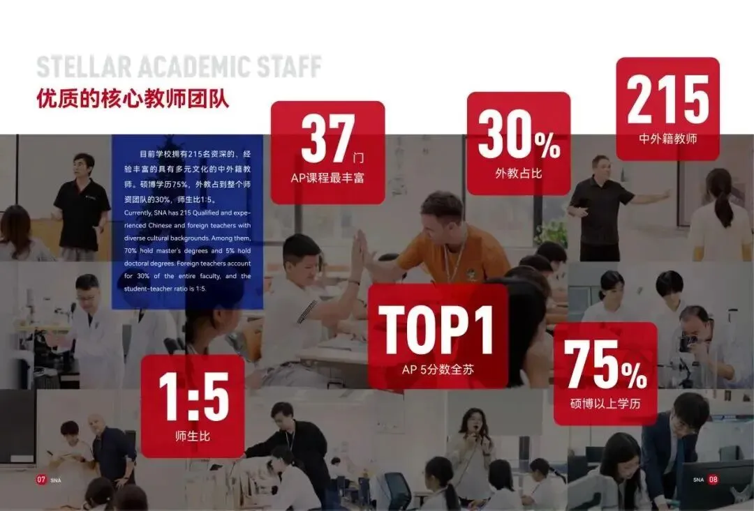 目前学校拥有215名资深的、经验丰富且具备多元文化的中外籍教师。硕博学历75%,外教占到整个师资团队的30%,师生比1:5。