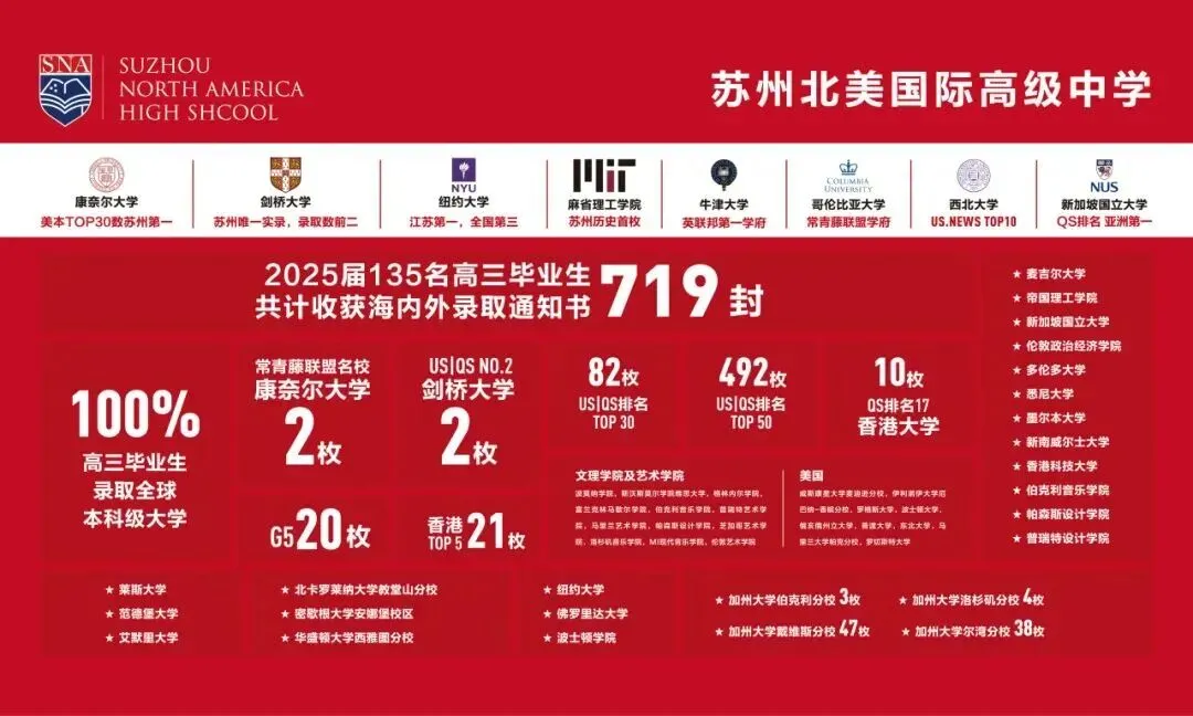 苏州北美国际高级中学在近三届毕业生中持续取得突破性升学成果,展现出强劲的全球顶尖名校录取实力。不仅在2023年诞生了苏州首位斩获麻省理工学院(MIT)本科录取的学子,更连续多年收获包括剑桥大学、康奈尔大学、西北大学在内的英美顶尖高校录取,彰显了在高端人才培养上的卓越竞争力。