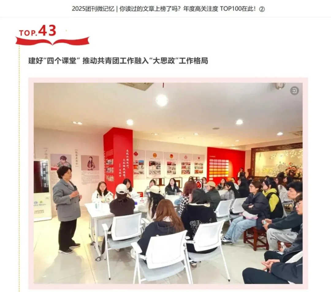 2022年9月,在学院第四次党代会工作报告中,党委提出开展全程育人,加强“宿舍微课堂”“教室小课堂”“校园全课堂”“社会大课堂”建设。2023年12月,共青团第七次代表大会胜利召开,“凝聚青春力量助力‘四个课堂’建设”写进团代会工作报告中。2024年7月,团委网站开启全面围绕“四个课堂”工作品牌形成系列宣传效应的时代。同年12月,“四个课堂”工作品牌代表江苏高职院校共青团,向团中央书记处领导做专题汇报,同年,该品牌建设在全省、全市共青团工作特色品牌交流会中展示。2025年3月,“四个课堂”工作品牌全面渗透融入共青团各项工作中,成为指引共青团工作融入“大思政”和“三全育人”格局的行动导向。
