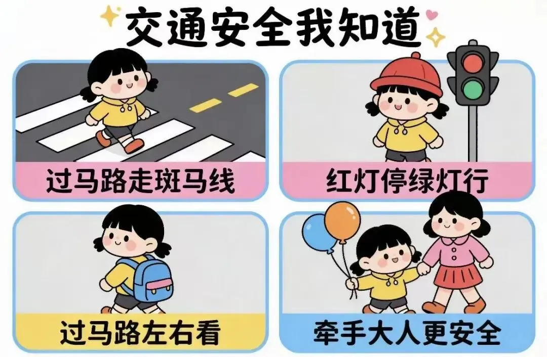 1.提醒孩子不在马路上玩耍、奔跑、打闹,过马路要走斑马线,遵守交通规则,看红绿灯指示通行。