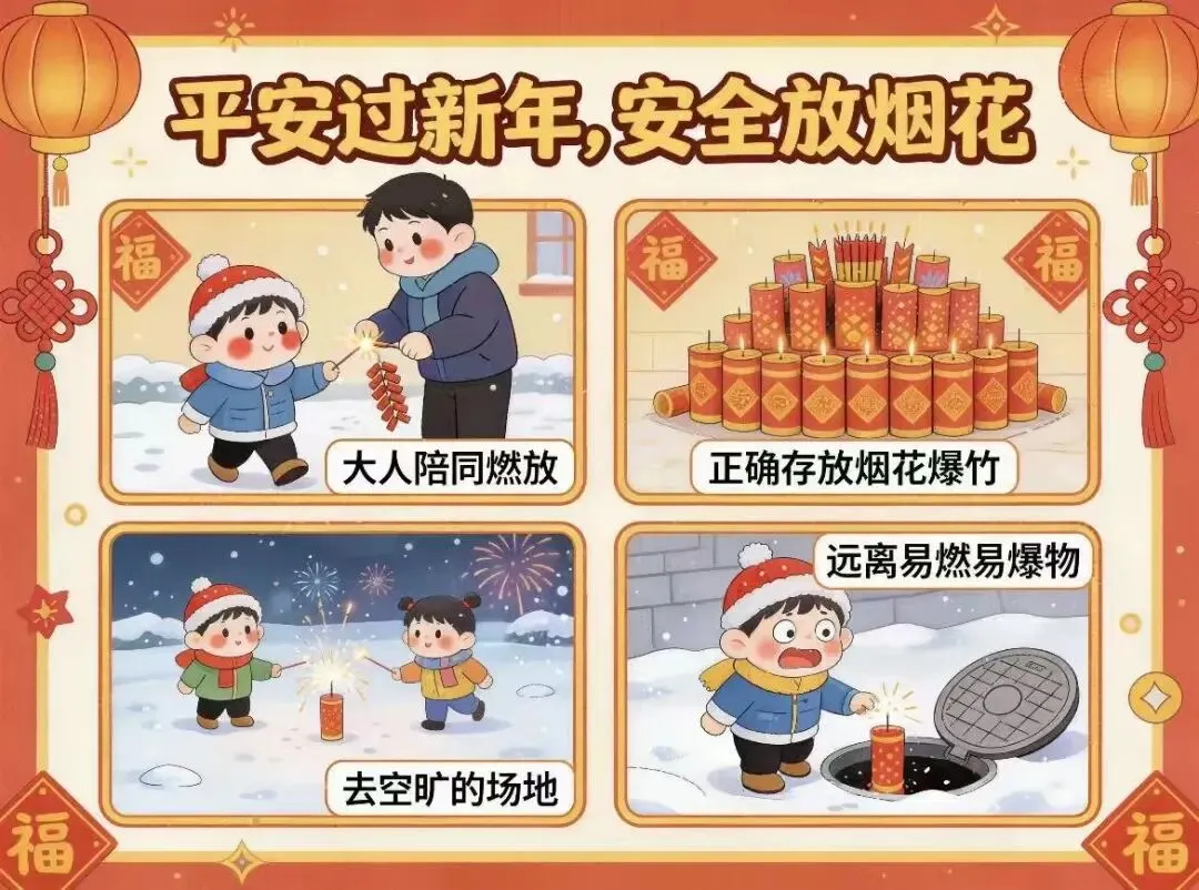 6.孩子一人在家时,知道不能给陌生人开门。1.春节燃放烟花爆竹一定要在可燃区域内并在成人的陪同下进行,避免烧伤炸伤。