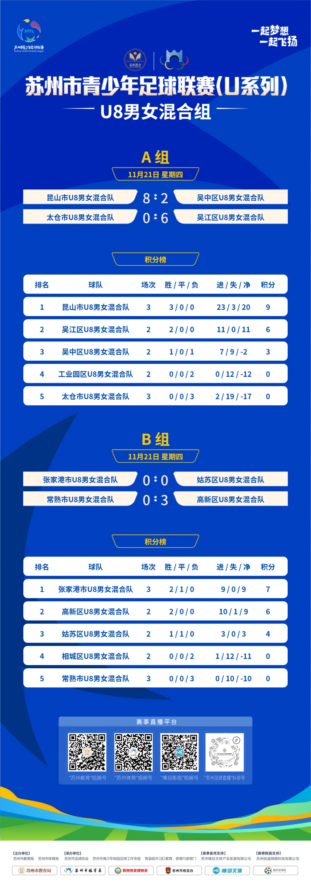 小组赛第三轮:昆山市U9男女混合队6:5胜吴中区U9男女混合队;张家港市U9男女混合队8:1胜姑苏区U9男女混合队;太仓市U9男女混合队0:7不敌吴江区U9男女混合队;常熟市U9男女混合队0:2负于高新区U9男女混合队。