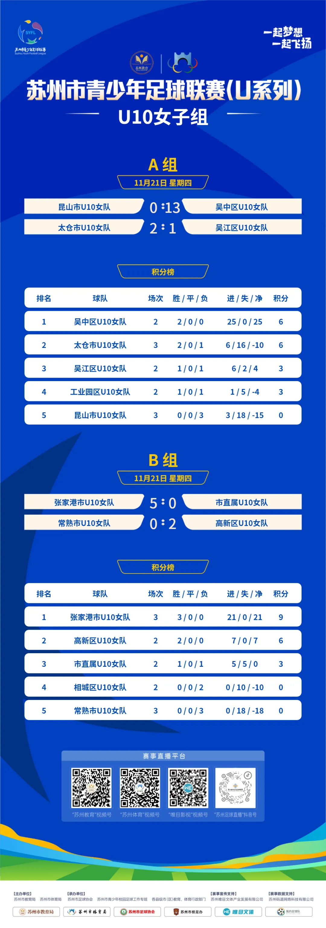 U12女子组小组赛第二轮:工业园区U12女队0:2负于昆山市U12女队;相城区U12女队0:6不敌张家港市U12女队;吴中区U12女队5:0赢了太仓市U12女队;姑苏区U12女队4:2胜常熟市U12女队。