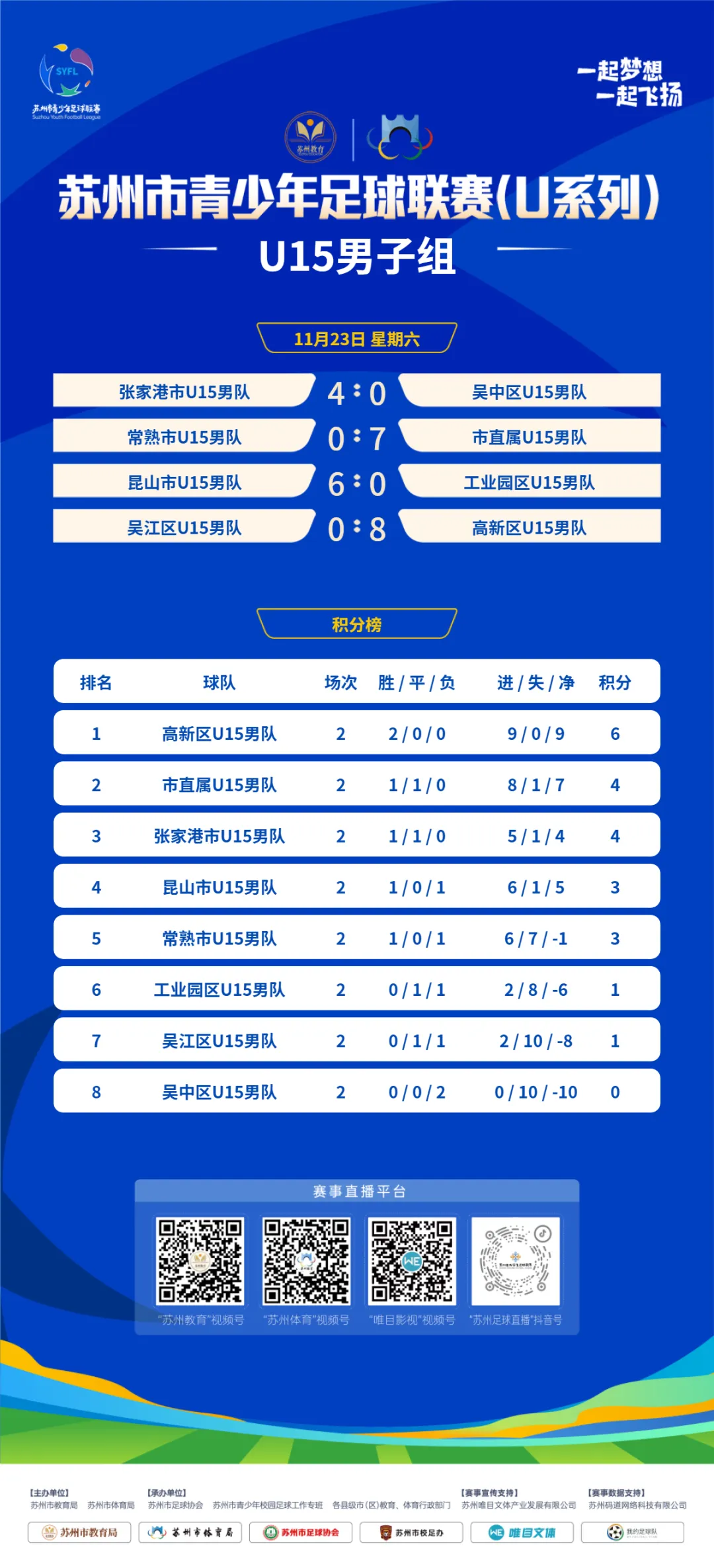 小组赛第二轮:张家港市U15男队今日状态火热,4:0战胜了吴中区U15男队;常熟市U15男队在与市直属U15男队的交锋中,虽全力以赴但仍未能改写比分,以0:7告负;昆山市U15男队攻势如潮,6:0胜工业园区U15男队;吴江区U15男队0:8负于高新区U15男队。
