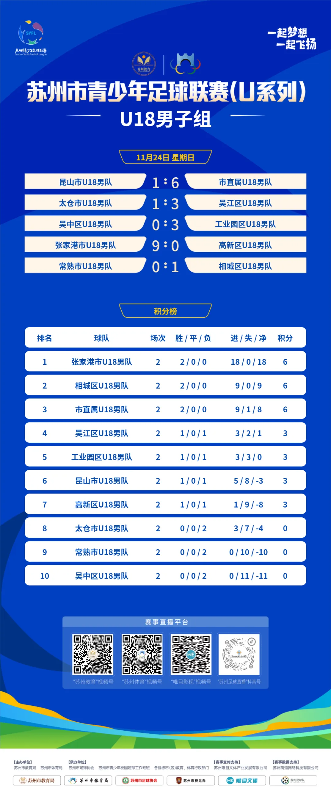 小组赛第二轮:昆山市U17男队5:0胜市直属U17男队;太仓市U17男队0:1负于吴江区U17男队;吴中区U17男队0:5负于工业园区U17男队;常熟市U17男队则以惊人的12:0的比分大胜相城区U17男队。