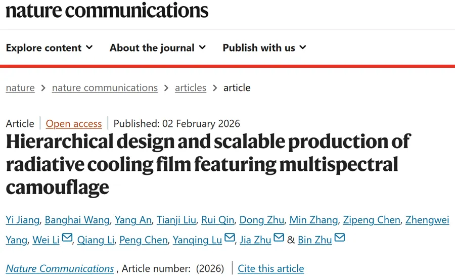 Jiang, Y., Wang, B., An, Y. et al. Hierarchical design and scalable production of radiative cooling film featuring multispectral camouflage. Nat. Commun. (2026).