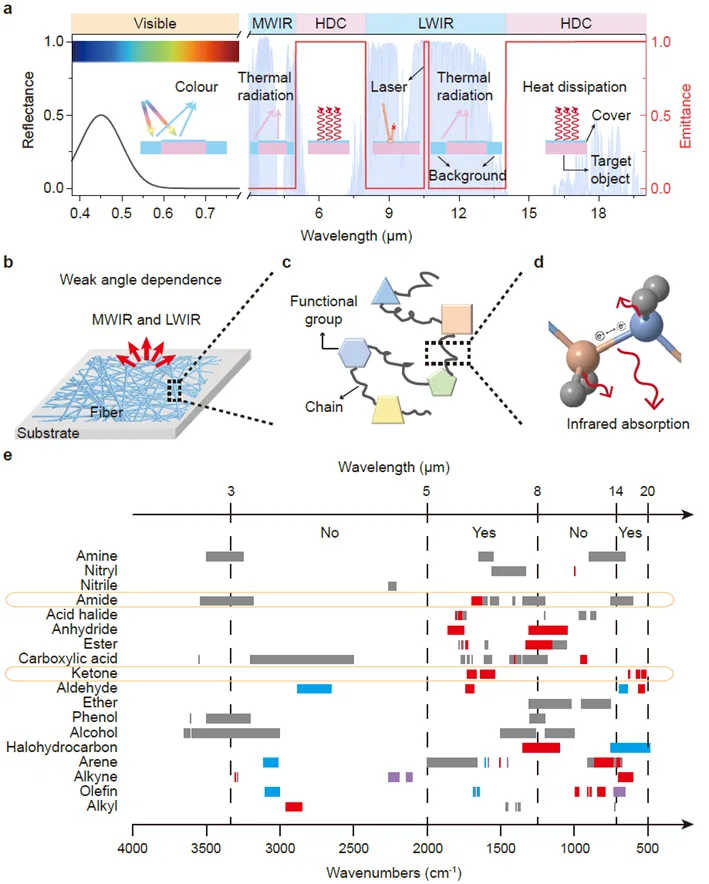在各种户外环境下,物体(人类、动物、设施等)的外观和光学特性往往需要同时满足两个主要目的:自身舒适度的保持和应对环境的自我保护。其中,制冷技术是应对全球变暖加剧和白天峰值温度上升的重要手段,而伪装是躲避危险的重要保护措施。然而,这两个要求因为共享类似的波段,因此往往存在光学上的矛盾。以辐射制冷和红外伪装为例,它们都集中在中红外波段(2.5-20 μm),但辐射制冷要求中红外高发射,而红外伪装要求3-5 μm和8-14 μm波段低发射,因此,设计中红外选择性光谱同时实现多光谱伪装和制冷性能至关重要。