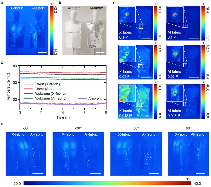 通过附有X-film(X-fabric)和铝箔(Al-fabric)的棉织物穿在假人模型身上进行多光谱伪装与降温性能验证,模型的胸部和腹部等主要部位贴有加热片模拟人体发热。