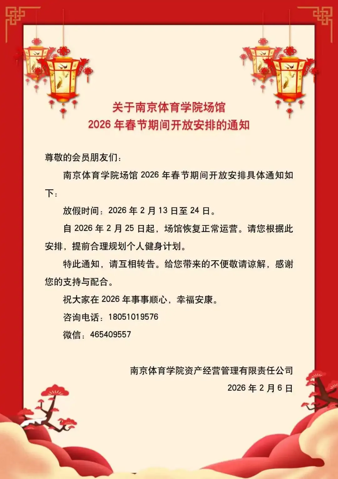 关于南京体育学院场馆2026年春节期间开放安排的通知