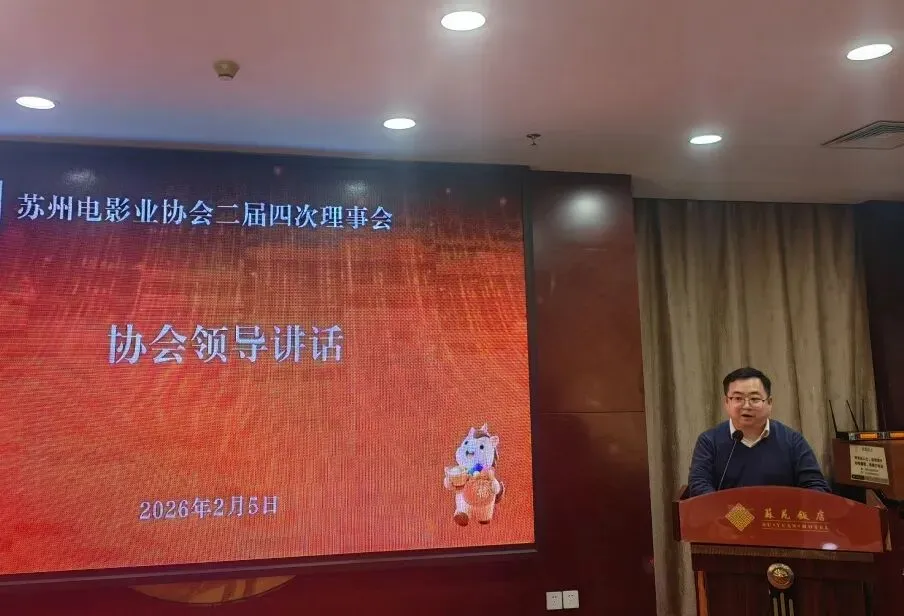 会议开始,苏州电影业协会秘书长陈太钟作了协会2025年度工作报告及2026年工作展望,他从协会内部建设、承接政府工作、探索文旅融合路径、坚持党建引领、惠民观影活动组织等方面对2025年度协会工作进行了全面总结,并指出2026年工作方向将聚焦“高质量发展、品牌化建设、融合化创新”。