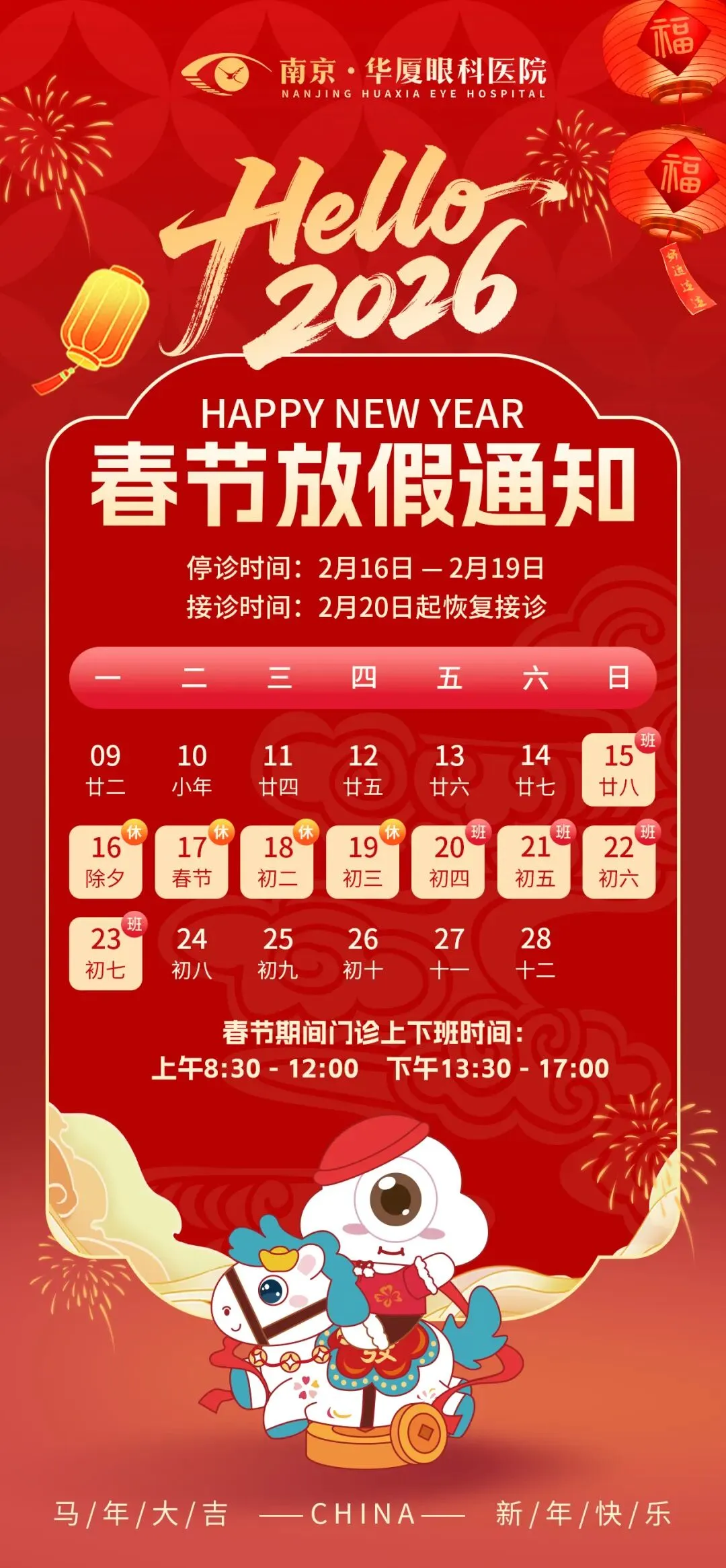 【通知】南京华厦眼科医院2026年春节假期就诊时间安排,请查收!