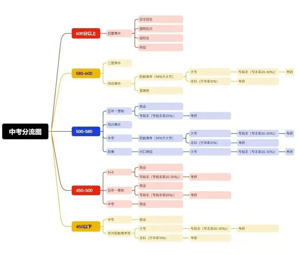 接下来讲到的升学途径中,涉及到2025年的统招录取分数线,有需要的家长可以参考之前讲到的中考分数换算得分比进行分数换算(插入文章链接),看看自家娃目前分数可以上什么高中~结合刚刚的思维导图我们可以看出普高的升学路径是高中→高考→本科/大专。普高也分三类,分别是公办普高、私立高中普通班、综合高中。公办普高,尤其四星高中录取的方式相对路径较多,接下来就让小周老师为大家详细介绍一下:最早录取的批次,根据中考志愿,按分数录取,满足条件的考生,可突破学籍所在区限制,报考其他五个区的部分公办高中。中考后的自主招生需报名自主招生志愿,一人限报一所。结合中考分数和自主招生面试成绩录取。部分顶尖高中在中考前,会提前选拔具有学科特长或创新潜质的学生。将优质高中的部分招生名额,按比例分配到各初中,结合中考志愿、根据学校排名在校内竞争录取。统招录取是进入普高最通俗的升学路径,学生凭中考总分,在全市范围内按志愿和分数排名进行统一录取,是主要的录取方式。想统招录取四星高中,除了吴江区要560+以外,其他区至少中考要600分左右,而想上普高的话 ,姑新园三区要580+,相城区要577分,吴中区要555分,吴江区要547分。每年11-12月各私立学校会启动报名,自招考合格即签约录取(自行组织考试或评估,提前锁定生源)。吴江区:民办学校录取需要填报中招志愿。