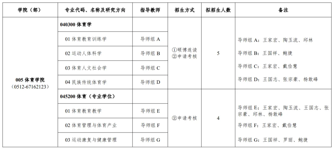 2026年体育学院博士学位研究生硕博连读/“申请-考核”制招生专业及导师(组)详见苏州大学研究生院网站招生工作板块:https://yjs.suda.edu.cn/84/74/c8385a689268/page.htm。