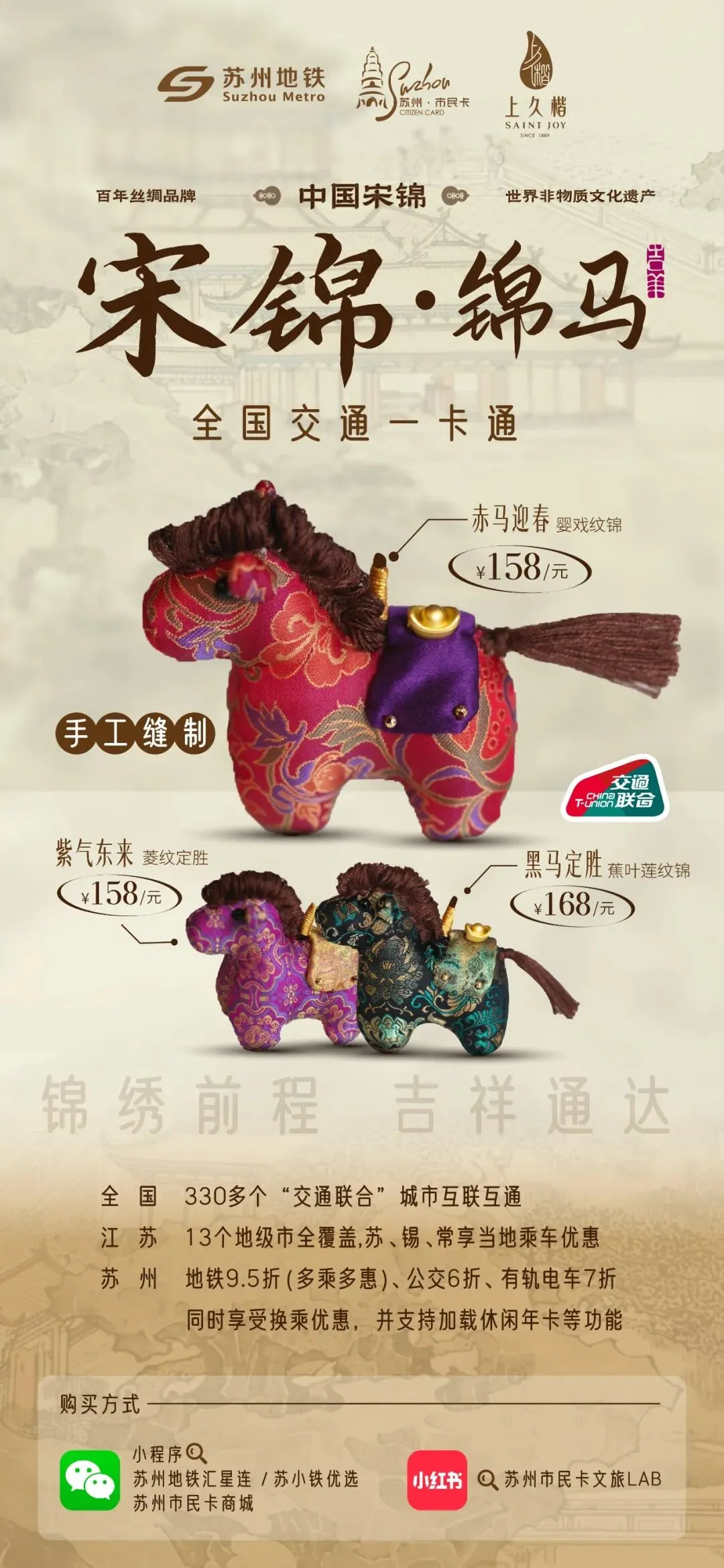 此次,我们以宋锦为帛,以骏马为形,将非遗技艺融入现代出行,推出三款 「宋锦·锦马」全国交通一卡通 。每一款纹样,都蕴藏一份匠心祝福;每一匹锦马,都凝聚一脉锦绣祥瑞;每一次刷卡,都开启一程通达好运。