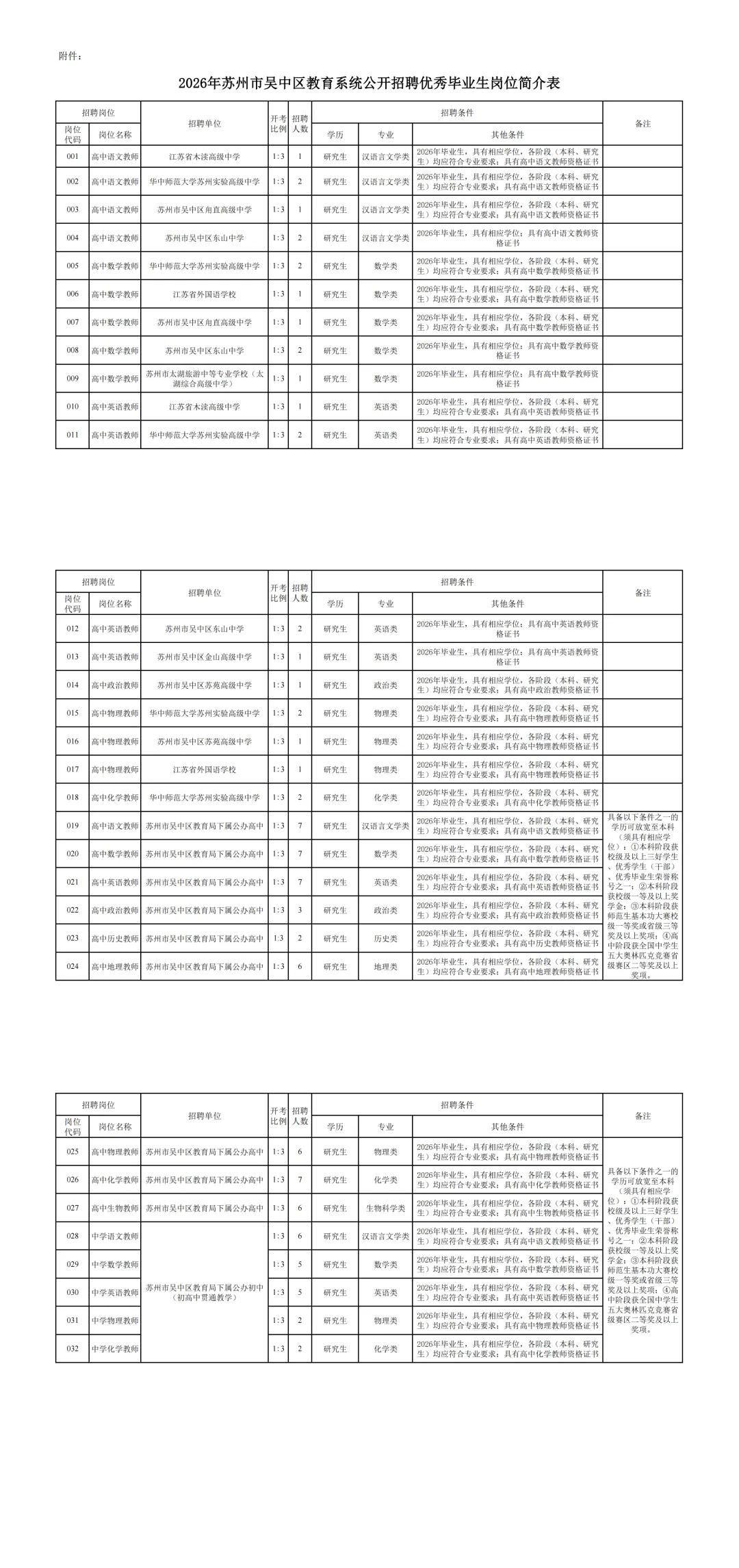 招聘岗位及条件等详见《2026年苏州市吴中区教育系统公开招聘优秀毕业生岗位简介表》(见附件,以下简称《岗位简介表》),可在苏州市人力资源和社会保障局网站(http://hrss.suzhou.gov.cn)、“吴中教育热线”网站(http://www.wxedu.net)上查询。