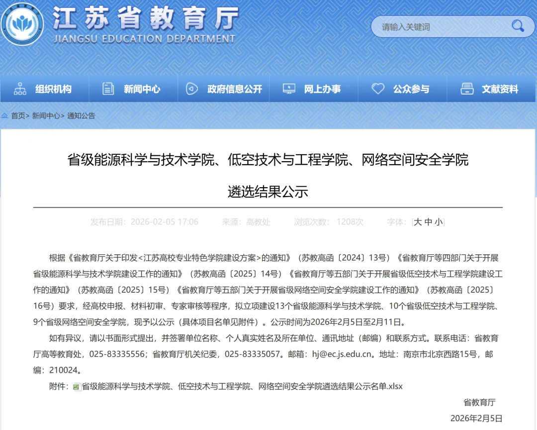 根据《省教育厅关于印发<江苏高校专业特色学院建设方案>的通知》(苏教高函〔2024〕13号)《省教育厅等四部门关于开展省级能源科学与技术学院建设工作的通知》(苏教高函〔2025〕14号)《省教育厅等五部门关于开展省级低空技术与工程学院建设工作的通知》(苏教高函〔2025〕15号)《省教育厅等五部门关于开展省级网络空间安全学院建设工作的通知》(苏教高函〔2025〕16号)要求,经高校申报、材料初审、专家审核等程序,拟立项建设13个省级能源科学与技术学院、10个省级低空技术与工程学院、9个省级网络空间安全学院,现予以公示(具体项目名单见附件)。公示时间为2026年2月5日至2月11日。