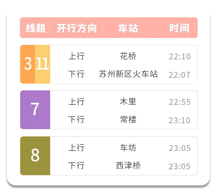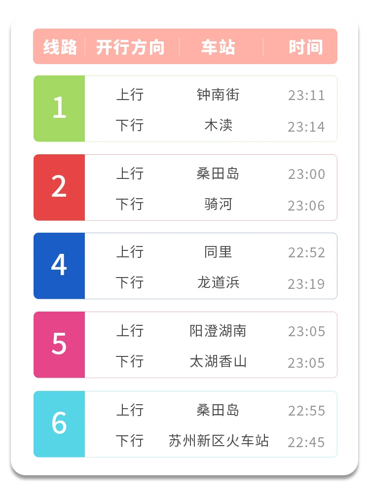 ➤为方便乘客合理规划出行,苏e行App提供各线路首末班车时间和车站列车时刻表查询服务,苏州地铁将通过官方微博、微信、车站电子信息屏动态发布出行提示信息。