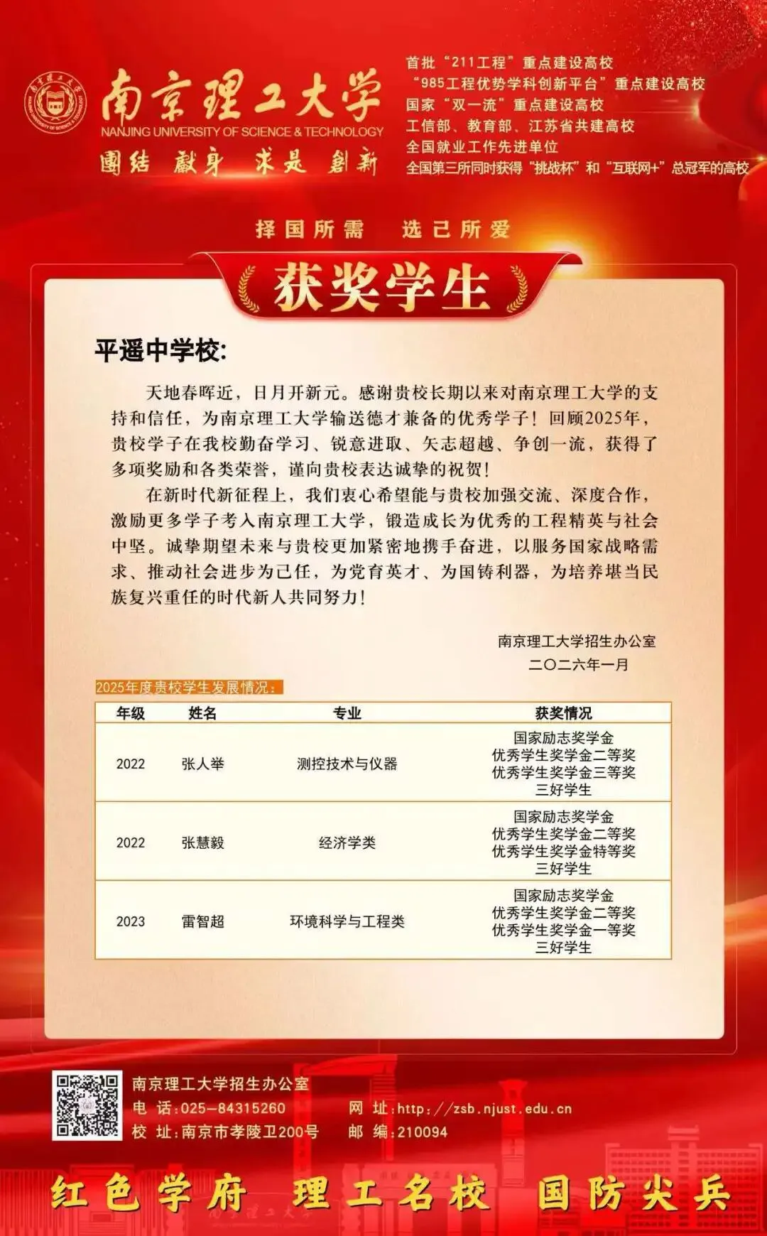 喜报 | 南京理工大学向平遥中学发来喜报!