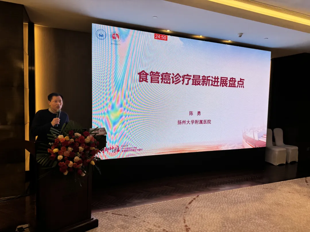 江苏省肿瘤医院曹国春教授开幕致辞,曹教授指出,我国食管癌防治正面临早诊率低、诊疗水平不均、多学科协同不足等严峻挑战。本次会议旨在推动规范化诊疗落地,通过强化多学科协作、促进优质医疗资源均质化传播,并依托医保政策支持,让临床有效、惠及患者的新方案广泛应用,从而提升整体诊疗水平,改善患者结局。
