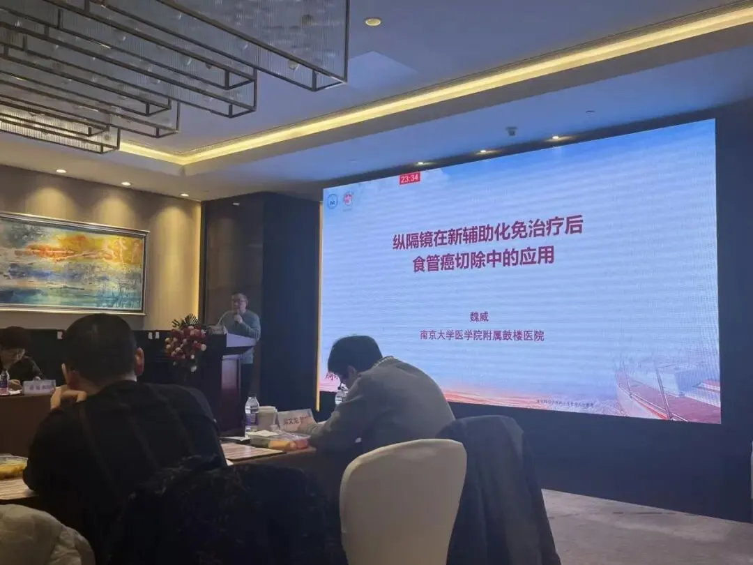 在徐州医科大学附属医院高超教授主持下,南京鼓楼医院魏威教授分享了《纵隔镜在新辅助免疫化疗后食管癌切除中的应用》。魏教授表示,尽管新辅助治疗(尤其是放化疗)提高了pCR率,但也增加了组织水肿和纤维化,从而提升了手术难度和并发症风险。纵隔径路作为一种“自然径路”,避免经胸手术的额外创伤,尤其适用于有胸腔粘连、肺功能差或年老体弱的患者,且无需单肺通气。鼓楼医院采用的经颈部切口直视下清扫喉返神经淋巴结(侧重冷兵器操作以减少神经损伤),并结合纵隔镜技术,能够实现与胸腔镜相当的淋巴结清扫程度,且具有双肺通气、无需单肺塌陷、术后肺炎和吻合口瘘发生率较低等潜在优势。该技术为接受新辅助治疗后的患者提供了另一种微创手术选择。