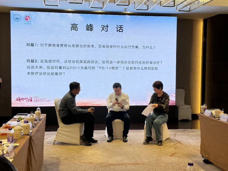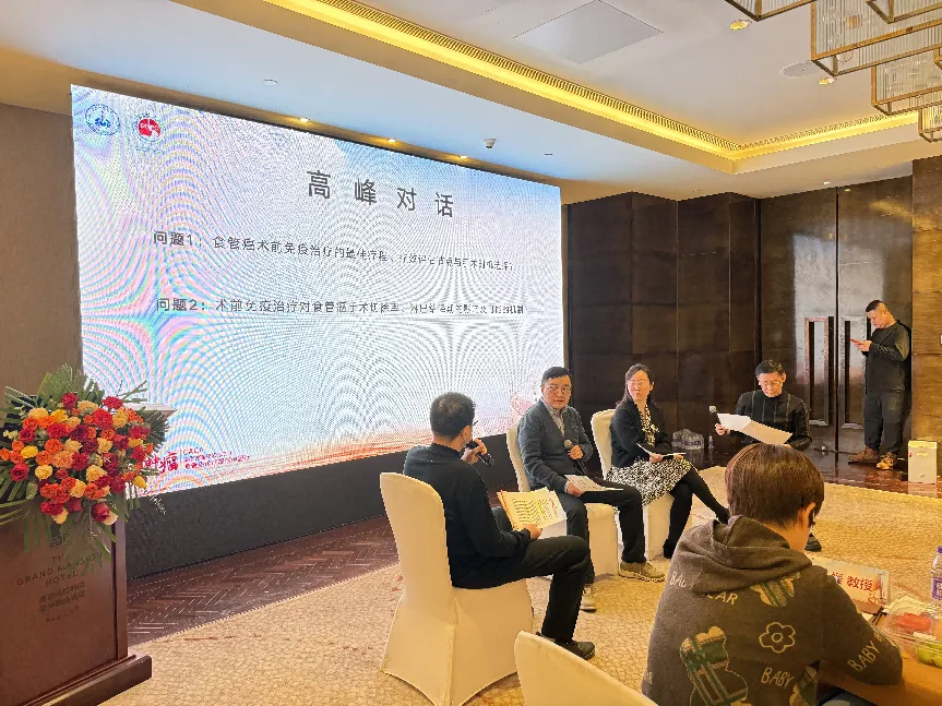 高峰对话环节,常州市第一人民医院顾文栋教授、徐州市中心医院袁媛教授围绕晚期食管癌的化疗和免疫治疗进行分析和探讨。关于化疗方案选择,临床中TP方案应用较多,FP方案亦可选。选择需综合考虑疗效、毒性和患者状况等。后免疫治疗时代的优化策略在于“精准高效个体化”,这包括基于生物标志物(如PD-L1、NOTCH1、ctDNA)的精细分层;多学科协作,在适当时机加入局部治疗;积极拥抱ADC、双抗等新机制药物;在保证疗效的同时,关注患者生活质量。