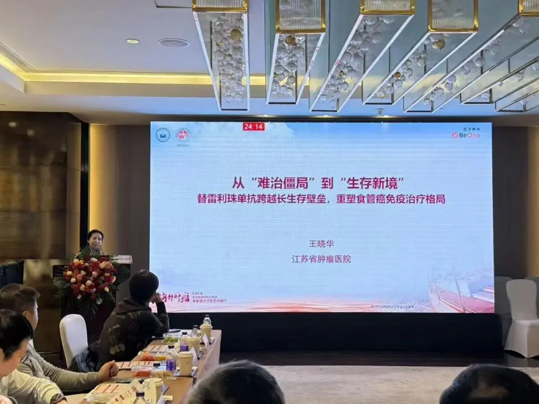 最后一个章节由苏北人民医院孙长江教授主持,江苏省肿瘤医院王晓华教授分享《从“难治僵局”到“生存新境”替雷利珠单抗跨越长生存壁垒,重塑食管癌免疫治疗格局》。王教授指出,中国食管癌发病具有地域和人群特征(男性、高龄为主),且整体预后较差。替雷利珠单抗在晚期食管癌一线(RATIONALE-306)与二线(RATIONALE-302)治疗中均实现显著生存获益。一线联合化疗中位总生存期(mOS)达17.2个月,提升6.6个月,近四分之一患者生存超过3年;二线单药治疗mOS达8.6个月,死亡风险降低30%。两项研究均显示客观缓解率(ORR)显著提升,且获益覆盖全球全人群,不受化疗方案、地域或PD-L1表达影响,奠定了替雷利珠单抗在一线和二线治疗中的地位。替雷利珠单抗是首个同时获NCCN/ESMO双国际指南推荐的国产PD-1单抗,并已在美国FDA及欧洲EMA获批用于食管鳞癌的一线与二线治疗。该药已获中国医保全覆盖,一线及二线适应症均可报销,且为目前唯一不限氟尿嘧啶类与铂类化疗方案均可医保报销的PD-1单抗,提升了临床用药的灵活性与可及性。