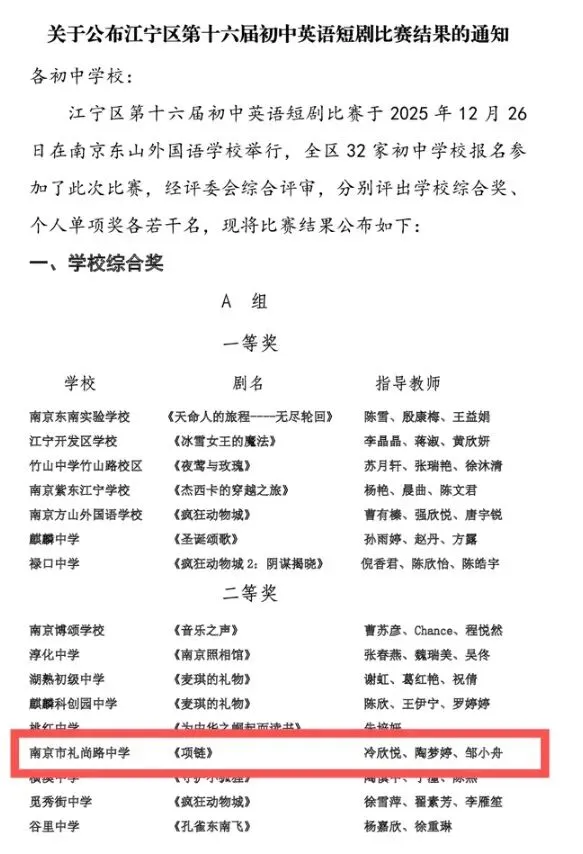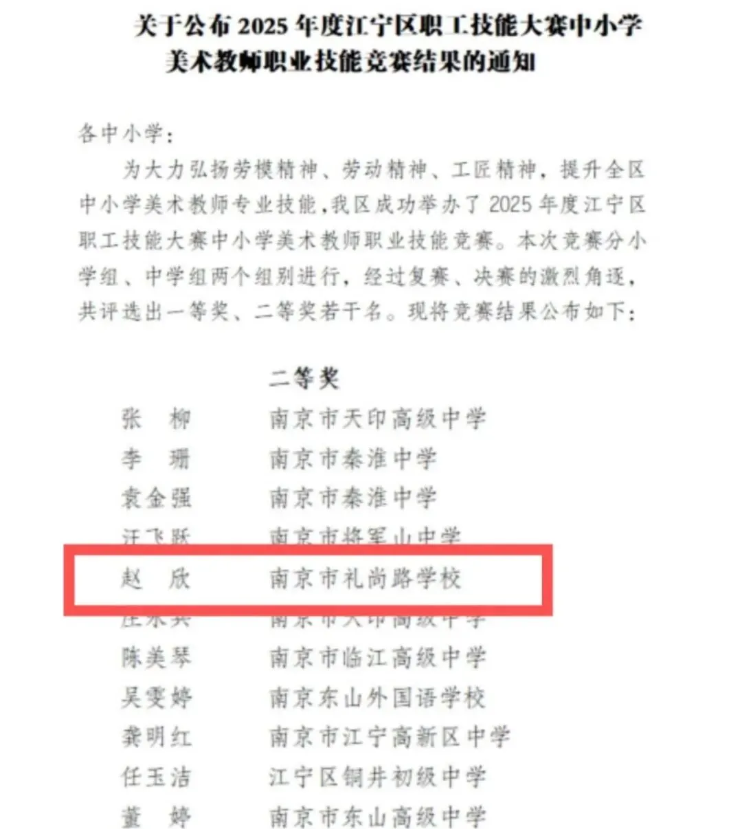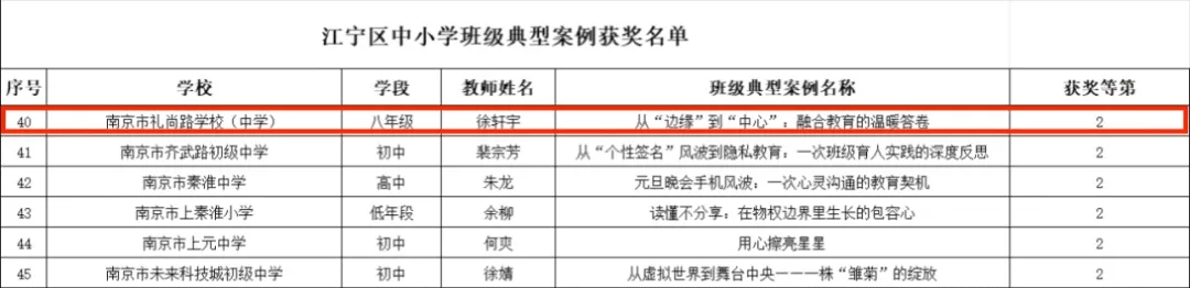 为进一步提高全市中小学德育工作实效,促进全市班主任专业发展,南京市教科所于2025年9月启动了“第六届主题班会设计” “第二届班级育人典型案例”评选活动。江宁区教科室进行了区级评选,经过专家评审,我校李翔老师、徐轩宇老师分别获得区级一等奖、二等奖。