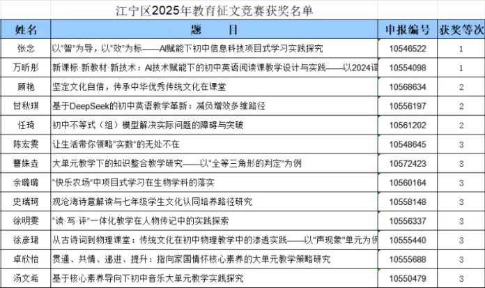 为推进全区教科研工作的开展,提高教师参与教科研活动的积极性,提升教师教科研能力,促进全区教育的改革与发展,江宁区开展2025年度教育征文竞赛活动。我校教师踊跃参加,并取得优异成绩,其中,张念、万昕彤两位老师的论文获得区一等奖并推市,张念老师获市一等奖。