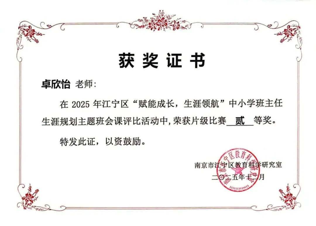 为深入贯彻落实立德树人根本任务,扎实推进素质教育,促进学生全面发展和终身发展,提升教师生涯规划教育的科学化与专业化水平,江宁区举办“赋能成长,生涯领航”中小学生涯规划主题班会课大赛活动。我校卓欣怡老师获得片级比赛二等奖。