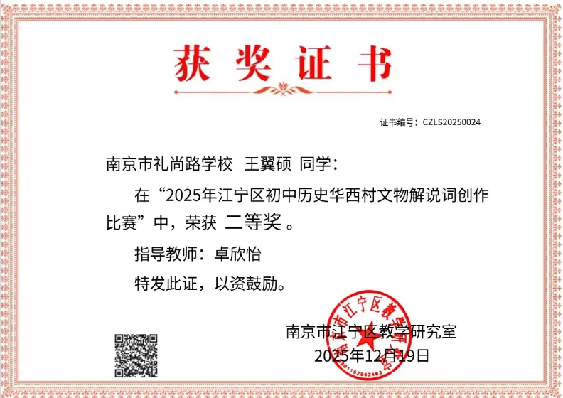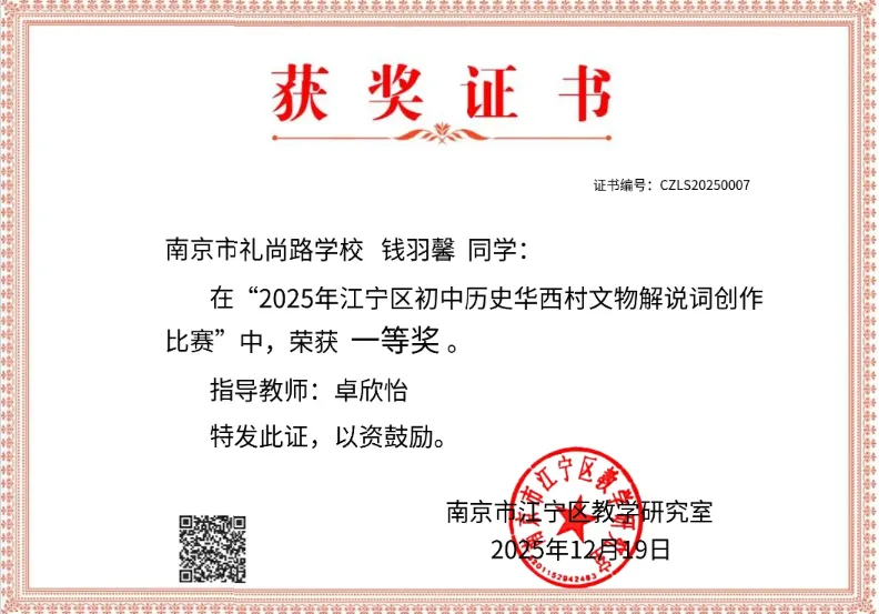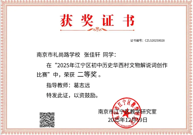 为厚植文化自信、增进我区初中生对江宁本土文化的了解,我区举办“寻宁”华西村出土文物解说创作比赛。赛事经校、片级选拔,分设区管组、街道组开展区级短视频赛,优秀选手于江宁博物馆进行现场决赛。经公正评审,层层选拔,我校钱雨馨、邱芯蕊、王翼硕、张佳轩斩获各级奖项。