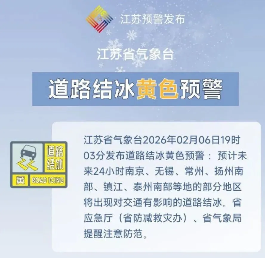 江苏省气象台2026年02月06日19时03分发布道路结冰黄色预警: