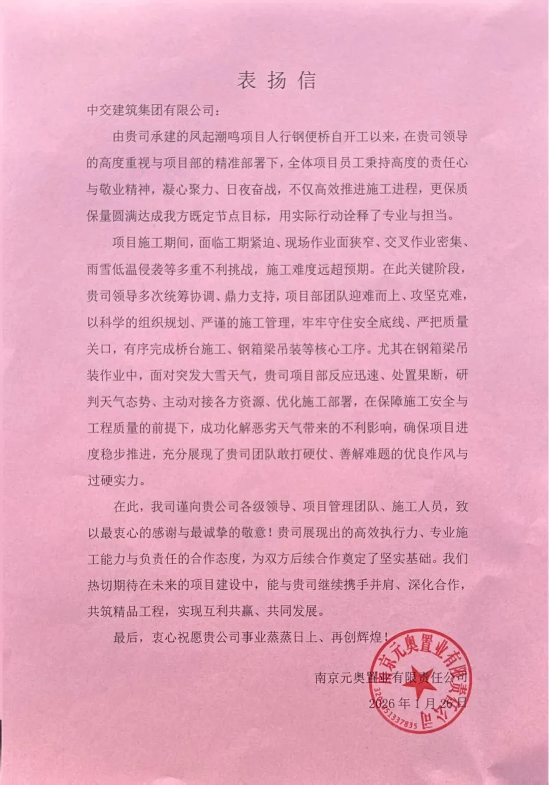 近日,南京绿城钢结构项目收到南京元奥置业有限责任公司发来的表扬信。信中对公司及项目团队在施工过程中表现出的组织协调能力、专业技术水平、高度责任心与敬业精神给予了高度赞扬和充分肯定,并对项目推进过程中所作出的努力表示感谢。