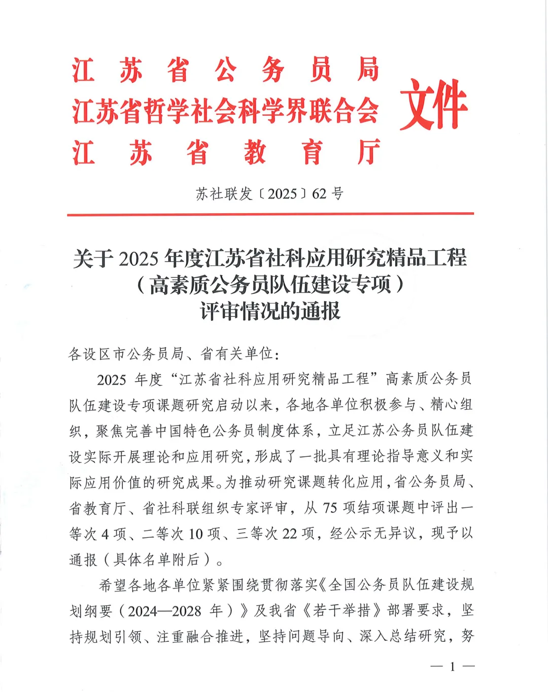 △获2025年度江苏省社科应用研究精品工程(高素质公务员队伍建设专项)优秀成果二等奖颁布文件