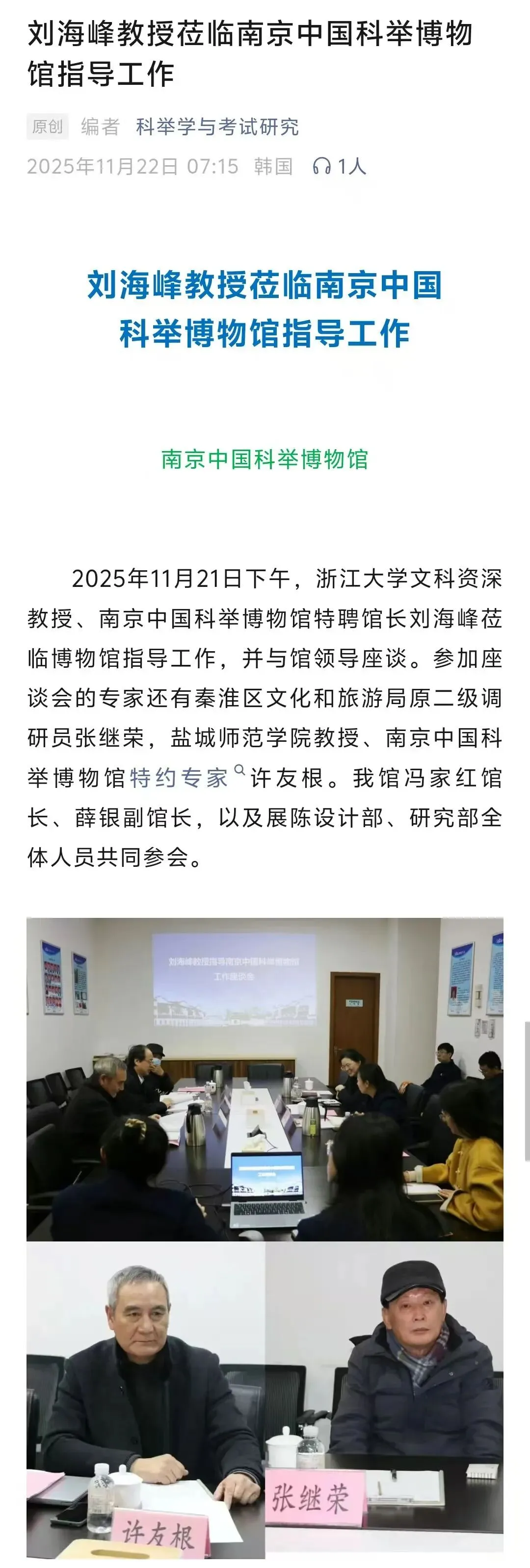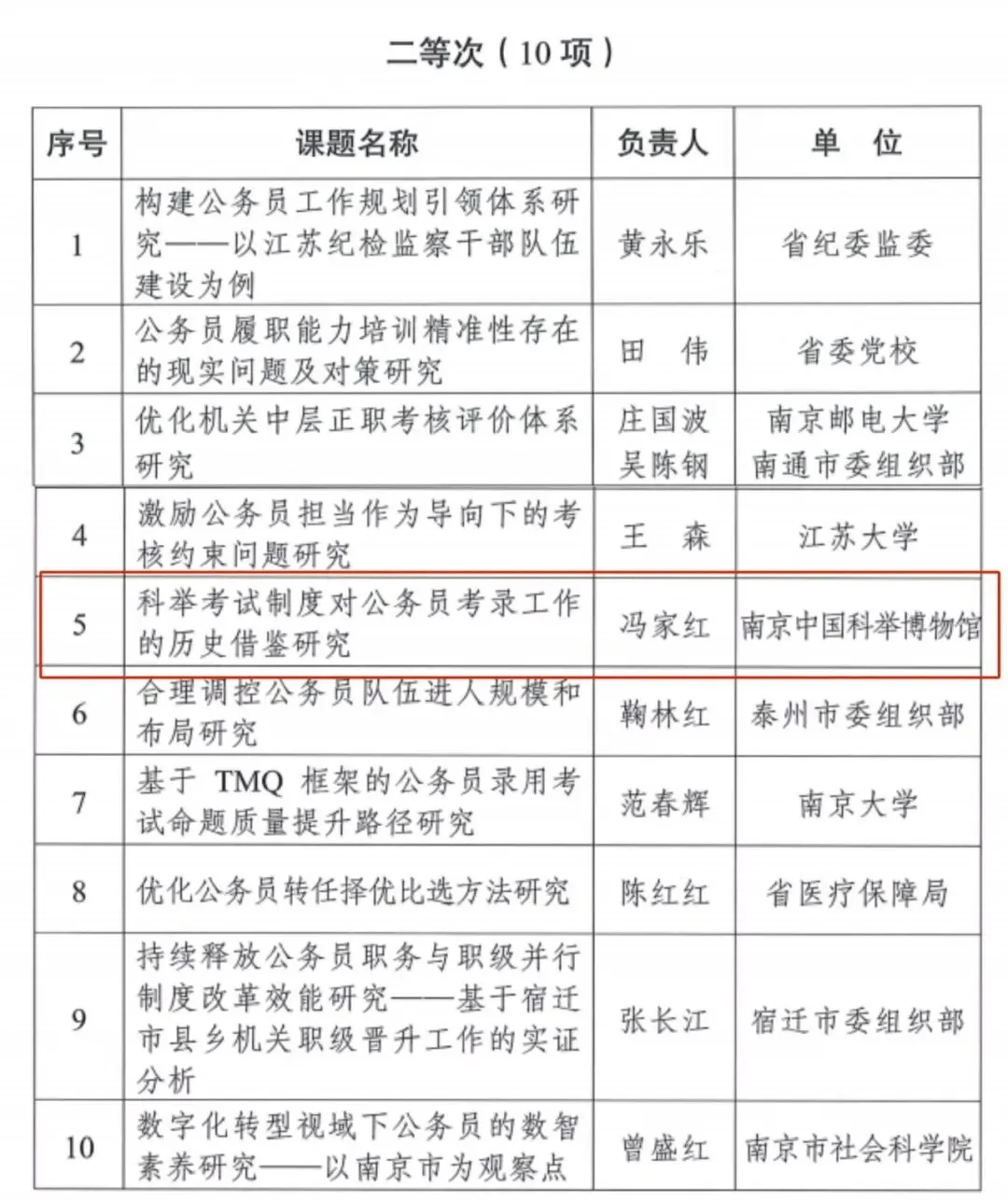 根据集团领导和科举博物馆领导部署安排,深度参与区委组织部牵头的相关课题,2025年3月区委组织部与博物馆成立课题专班,并确定“科举考试制度对新时代公务员考录工作的启示”课题项目。7月研究中心3名人员借调区委组织部开展该课题研究工作。6-8月,先后邀请浙江大学文科资深教授、南京中国科举博物馆特聘馆长刘海峰,特约专家许友根、南京开放大学陈社育等专家进行研讨共达8次,根据专家的意见修改文稿数十次,确保研究成果更具学术价值与实践意义,最终形成1.2万字的学术汇报稿。项目获评2025年度江苏省社科应用研究精品工程(高素质公务员队伍建设专项)优秀成果二等奖;