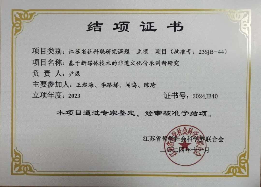 研究中心与宣传部联合申报的江苏省社科联研究课题《基于新媒体技术的非遗文化传承创新研究》顺利结项。