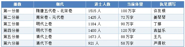 推进《江苏历代进士录》项目,该书是一本收录科举时代,现今江苏省域进士出身人物的传记类书籍。全书分为六个分册,现已完成隋唐五代卷、北宋卷的书稿定稿,其他卷初稿撰写等工作。具体情况见下表:
