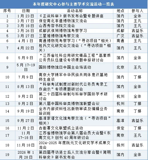另外参加国际博物馆日中国主会场活动、南京大学铸牢中华民族共同体意识基地师生座谈、保定南北非遗博物馆交流座谈,江苏省博物馆学会第八届会员大会暨《东南文化》创刊40周年研讨会等会议活动;赴高淳家谱文化馆参加寻访项目相关考察交流活动、赴保定市参加古衙署文化联盟成立活动,赴扬州参加2024-2025年度阮元文化研究学术成果交流会;以及参加全市内部资料性出版物审读及编辑业务培训班,提升编辑业务能力。