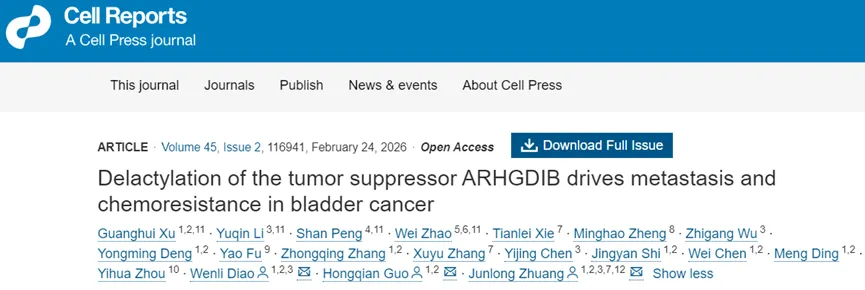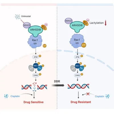 新兴证据强调乳酸化是代谢与肿瘤进展之间的关键联系。2026年2月3日,南京大学庄君龙、郭宏骞及刁文丽共同通讯在Cell Reports 在线发表题为“Delactylation of the tumor suppressor ARHGDIB drives metastasis and chemoresistance in bladder cancer”的研究论文。本研究通过整合乳酰化修饰组与蛋白质组分析,描绘出膀胱癌中蛋白质赖氨酸乳酰化的整体图谱,鉴定出Rho二磷酸鸟苷解离抑制因子β(ARHGDIB)的赖氨酸47位(K47)和赖氨酸50位(K50)为乳酰化修饰位点。组蛋白去乙酰化酶2(HDAC2)介导的去乳酰化修饰会抑制ARHGDIB的抑癌功能,进而促进膀胱癌的转移与顺铂耐药。机制上看,ARHGDIB的脱乳化降低了其对Rac1的结合亲和力,促进Rac1膜的易位和活化。这一过程会通过Rac1-MRN-ATM-CHK2信号轴增强肿瘤细胞的DNA损伤修复能力。临床研究发现,ARHGDIB-K50位点的乳酰化水平降低与膀胱癌的顺铂耐药及患者不良预后密切相关。I类HDAC抑制剂恩替诺特可通过抑制ARHGDIB的去乳酰化修饰,与顺铂产生协同抗肿瘤作用。综上,本研究揭示了一种独特的调控模式,抑癌蛋白的去乳酰化修饰可驱动肿瘤转移与化疗耐药;而以HDAC抑制剂靶向调控乳酰化修饰的动态变化,或为膀胱癌的临床干预提供新的思路与方向。